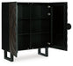 | Details | Made with solid wood and engineered wood, Distressed black finish, Wood legs, Door fronts with carved pattern, Wood door pull, 2 doors, 2 shelves, Minor assembly required; simply lay flat and attach legs | |
