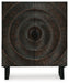 High style is on the rise with this wood accent cabinet. Its stunning doors, graced with a carved sunburst pattern and oversized wood pull, open to reveal two shelves. A distressed black finish adds contemporary flair. Whether this cabinet is accommodating storage needs or hiding clutter, it's truly a showpiece.