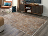 This area rug is a stellar study in color, movement and texture. Featuring a watercolor abstract effect in shades of cream, orange, brown, gray and blue, this vibrant rug makes a statement wherever it is displayed.