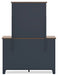 | Details | B414B2: Includes panel headboard, footboard, rails and slats, Made with hardwood solids, mindi wood veneer and MDF substrates, Two-tone finish features a dark slate blue with a light brown wood-tone top, Foundation/box spring required, sold separately, Mattress available, sold separately, Assembly required, B414B1: Includes dresser and mirror, Made with hardwood solids, mindi wood veneer and MDF substrates, Two-tone finish features a dark slate blue with light brown wood-tone top, Nickel-tone metal knobs, 6 drawers with fully finished interior, dovetail construction and heavy duty ball-bearing side glides, Mirror attaches to back of dresser, | |