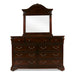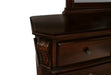 The Emilie Mirror in Tudor Brown is a beautifully crafted piece that combines timeless elegance with superior functionality, making it an exquisite addition to any bedroom. Masterfully constructed from solid poplar, birch, maple, and real wood veneers, this mirror showcases the enduring strength and natural beauty of premium woodwork. Each piece is meticulously finished with a hand-applied multi-step process in warm brown tones with hints of cherry, which highlights the intricate carvings and allows the unique grain of the wood to shine through, ensuring that no two pieces are exactly alike. The sophisticated traditional design features a harmonious blend of acanthus leaf corbels, intricate scrollwork, fancy face veneers, graceful arched crowns, and elegantly scrolled feet, all contributing to a timeless aesthetic. Encased in elegant plaster and crown moldings, the mirror features clear, low-distortion beveled glass that offers both impeccable functionality and a flawless reflection. The Emilie Mirror is a perfect choice for those who appreciate classic design and high-quality craftsmanship in their home décor.