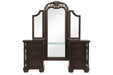 The Royal Classics Maximus Vanity Table Mirror in Madeira Brown is the perfect companion to the Maximus vanity table, offering both beauty and practicality. Crafted from solid poplar and premium birch veneers, this mirror is designed to provide enduring elegance and durability. The multi-step finish accentuates the rich wood grain, while delicately burnished gold tipping highlights the intricate Baroque-inspired carvings, adding a luxurious touch to its refined design. The beveled, low-distortion mirror ensures unmatched clarity, and the adjustable side wings allow you to customize the angle for a flawless reflection every time. This mirror is both a functional and exquisite addition to any vanity space, blending timeless sophistication with modern convenience.