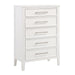 The Andover Five Drawer Wood Chest in White combines durability, functionality, and timeless style, making it a standout addition to any bedroom. Expertly crafted from solid Rubberwood, manufactured woods, and wood veneers, this chest is built to last while highlighting the natural beauty of real wood. The semi-gloss white finish offers a crisp, versatile appeal that effortlessly complements a wide range of décor styles, whether modern or traditional, enhancing your space with a fresh and refined look. The Andover 5 Drawer Chest embodies understated contemporary design with clean lines that create a seamless and cohesive aesthetic. Sleek, elongated metallic handles add a touch of sophistication, standing out gracefully against the pristine white finish, while framed drawer fronts provide visual depth and dimension. Supported by sturdy block-style legs, this chest ensures a solid foundation, reinforcing the collection’s robust and lasting construction. The drawers glide effortlessly on robust Kenlin drawer glides, ensuring smooth and reliable operation, and feature dovetail joinery, reflecting superior craftsmanship and enduring quality. This chest offers ample storage space while enhancing your bedroom with its elegant and refined design.