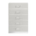 The Europa 5 Drawer Chest in white combines modern elegance with practical functionality. This chest features a sleek, sophisticated look with a gleaming white finish, mylar accents, and acrylic drawer pulls. Quality craftsmanship is evident in the eco-friendly manufactured woods, assembled with durability in mind, and finished with a glossy white topcoat. Upscale extras include a silver mylar pedestal base that elevates the glamour of this piece. The sturdy, well-constructed drawers feature dovetail joinery and ball bearing glides for a durable, easy-glide operation, with interiors finished for snag-free storage. The five spacious drawers provide ample storage for clothing, making this chest both a stylish and practical addition to your bedroom. Choose the Europa 5 Drawer Chest for a blend of contemporary style and high-quality craftsmanship.