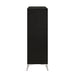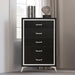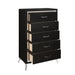 The Huxley 5-Drawer Chest in Black combines contemporary glam with durable construction for a stylish addition to your bedroom. This vertical dresser is crafted from manufactured woods and eco-friendly decorative laminate, ensuring it will stand the test of time. The design features clean lines with metallic accents and flared silver legs, adding a modern touch. Its rich black finish provides a sleek, sophisticated look that is both timeless and modern, highlighting the metallic accents and smooth surfaces for a chic and polished aesthetic. The quality drawer construction includes English dovetail joinery and smooth-rolling center glides for long-lasting operation. Functional and fashionable, this chest offers ample storage for clothing, with chic, crystal-studded drawer pulls for easy access.