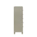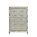 Introducing the Radiance 5 Drawer Chest in Platinum Silver, meticulously crafted for lasting stability and durability from a combination of Solid Rubberwood and manufactured woods. Its semi-gloss lacquer Platinum Silver finish lends a silky, modern touch to this captivating collection. Glossy textured inlays and mylar trim elegantly frame the drawers, showcasing a crushed crystal decorative laminate front adorned with brushed chrome finish handles featuring inset crystal accents. With five heirloom quality English dovetail drawers equipped with full extension glides, organizing your essentials becomes effortless. The finished interiors ensure snag-free storage, while the felt lining in the top drawers offers added protection for delicate items like jewelry, watches, or glasses. Experience the perfect blend of functionality and glamour with the Radiance 5 Drawer Chest.