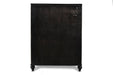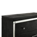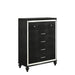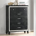 The Valentino 5 Drawer Chest in classic black is a testament to enduring craftsmanship crafted from a blend of manufactured and solid woods, adorned with exquisite embossed inlays. Radiating with glitz and glam, its gleaming finish, mirrored trims, crystal-studded drawer pulls, and alligator-embossed accents capture the essence of Hollywood allure. Delight in its thoughtful details, from heirloom-crafted English dovetailed drawers with snag-free interiors to smooth full-extension ball-bearing glides. With an abundance of storage, this chest offers ample space to organize your clothing and belongings effortlessly. Experience luxury and functionality combined in this distinctive piece—a must-have addition to any bedroom sanctuary.