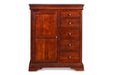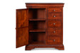 The Versailles Door Chest/Wardrobe Chest in Bordeaux Cherry is a perfect combination of timeless design and practical storage, making it an elegant addition to any bedroom. This door chest is meticulously crafted from solid Poplar, manufactured woods, and genuine basswood and poplar veneers, showcasing the enduring beauty and strength of premium woodwork. The classic Louis Philippe design, with its refined curves, clean lines, and rich cherry finish, brings a sophisticated touch to your space. The chest features spacious drawers with English dovetail joinery and smooth-finished interiors, offering snag-free storage that glides effortlessly on precision side-mounted drawer glides. Behind the door, you'll find a roomy storage area with two adjustable shelves, ideal for organizing bulkier garments and keeping your wardrobe neatly arranged. The hand-rubbed, multi-step warm cherry finish enhances the wood's natural hues and intricate grain patterns, revealing the true character and depth of the piece. Combining beauty, quality, and thoughtful design, the Versailles Door Chest is both a functional storage solution and a stylish focal point for your bedroom.
