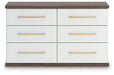 Looking to make a subtly striking statement in your bedroom? We've got you covered. This dresser's sophisticated two-tone treatment marries a warm brown finish over replicated walnut grain with a matte white finish. Rounded corners and a thick top radiate an air of modern panache, while sleek handles in a champagne finish add a sparkling touch to the spacious drawers. It’s a master class in contemporary yet comfortable character.