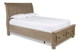 The Allegra Storage Sleigh Bed in a sophisticated pale pewter finish is a perfect blend of durability, style, and functionality. Expertly crafted from solid Mindi wood, engineered woods, and wood veneers, this bed offers exceptional durability and showcases the natural beauty of Mindi''s rich grain. Its resistance to decay ensures it remains a stunning centerpiece in your bedroom for years to come, while the use of sustainably sourced materials makes it an environmentally responsible choice. The meticulous multi-step finish, enhanced by a delicate brush treatment and subtle white hang-up effect, adds depth and character to the design, making it a timeless addition to any space. This transitional piece seamlessly fits both traditional and contemporary interiors, with clean lines and subtle curves that create a refined, elegant aesthetic. Beyond its visual appeal, this sleigh bed also offers stylish functionality—unwind against the gently angled headboard, designed for comfort, and keep your bedroom organized with the spacious footboard storage drawers, perfect for storing extra linens or other essentials. The Allegra Storage Sleigh Bed is an ideal choice for those seeking a combination of classic style, modern sophistication, and practical storage solutions.