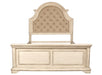 Romance your bedroom with the New Classic Furniture Anastasia Bed, a marvel of real wood construction crafted from solid poplar and oak veneer for unparalleled durability. The heirloom finish, achieved through a meticulous multi-step process involving wire brushing, clefts, rasping, threading, and rub throughs, creates an upscale, vintage look with each piece being one-of-a-kind. The creamy off-white stain, enhanced with brown and gray burnishing, exudes vintage French country cottage charm. Softly arched molding frames the easy-care 100% polyester button-tufted upholstered headboard, creating a welcoming ambiance. This bed goes beyond aesthetics with functional USB charging ports on either side of the headboard, providing a convenient place to charge devices. All furniture complies with safety standards, ensuring your comfort and peace of mind. With a 1-year limited warranty, the Anastasia Bed seamlessly combines timeless design with modern functionality for a secure and stylish addition to your bedroom.