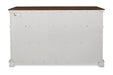 Complete your bedroom with the New Classic Furniture Anastasia 7 Drawer Dresser, a testament to real wood craftsmanship with solid poplar and oak veneer for enduring durability. The heirloom finish, achieved through a meticulous multi-step process involving wire brushing, clefts, rasping, threading, and rub throughs, grants each dresser an upscale, vintage look, ensuring that no two pieces are exactly alike. The creamy off-white stain, enriched with brown and gray burnishing, radiates vintage French country cottage charm, harmonized by a rustic brown finish top that encapsulates the antique, old-world charm. The dresser's graceful composition is defined by picture frame drawer fronts, bracket feet, detailed crown molding aprons, and chamfered panel appliques, complemented by antique gold drop ball drawer pulls. Drawer operation is effortless with ball-bearing glides, providing a smooth and easy open performance. Enjoy clean and carefree storage with all drawers sanded and sealed, and top drawers lined with felt to safeguard delicates, watches, jewelry, and glasses. The bottom drawers are cedar-lined, offering a cozy haven for sweater storage. The time-tested quality is evident in the four-corner English dovetail joinery, ensuring a strong and durable piece of furniture. Rest easy knowing that this dresser complies with safety standards, delivering a secure and stylish storage solution.