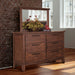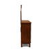 The Cagney Dresser Mirror in Chestnut Brown combines durability with timeless elegance, making it a perfect complement to any bedroom décor. Constructed from solid Rubberwood, premium engineered woods, and authentic Acacia wood veneers, this mirror is built to last while maintaining the natural warmth and beauty of the wood. The hand-rubbed, multi-step chestnut brown finish, enhanced by a subtle charcoal glaze, deepens the rich tones and highlights the intricate, timeworn details, giving the mirror a sense of heritage and refined craftsmanship. The wide moldings encase crystal-clear, low-distortion beveled glass, providing a flawless reflection that enhances the room's sophistication and elegance. This mirror is not only a functional addition but also a beautiful piece that adds a touch of classic style to any space.