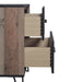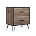 The Elk River Two Drawer Nightstand offers a seamless blend of functionality and rugged charm, making it an essential addition to any bedroom. This nightstand is meticulously crafted from eco-friendly manufactured woods and finished with a decorative laminate that is both scratch-resistant and durable, ensuring it maintains its heirloom-quality appearance over time. The rustic brown finish and weathered look lend an air of antiquity that complements its modern industrial design, highlighted by sturdy metal legs and cast iron trims for an edgy, loft-like vibe. Designed to provide ample storage, the nightstand features two drawers that are perfect for keeping bedside essentials organized and within easy reach. Each drawer is constructed with English dovetail joinery and operates on smooth Kenlin center glides, combining time-tested quality with exceptional ease of use. Whether paired with other pieces from the Elk River collection or as a standalone item, this nightstand enhances any bedroom with its practical elegance and striking aesthetic.