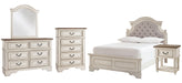 Elevating the art of traditional cottage styling, this bedroom set is your dream retreat realized. A sumptuous beauty, the upholstered bed wows with a distressed chipped white finish for heirloom appeal. Deep tufting on the cushioned upholstered headboard adds such a cozy element sure to put you at ease. Framed drawer fronts, decorative corbels, bail pulls and contrasting wood finished surfaces only add to the charm.