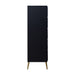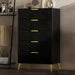 The Kailani 5 Drawer Chest in black seamlessly combines modern design, durability, and eco-friendly construction, making it an elegant and sustainable choice for any bedroom. Crafted from a blend of solid rubberwood, engineered wood, and eco-friendly decorative laminate, this chest is built to last, offering superior resistance to scratches, moisture, and stains to maintain its beauty with minimal upkeep. The modern minimalist design is highlighted by clean lines, a sleek silhouette, and chic ribbed textures, with slim metallic handles and tapered legs that enhance its contemporary appeal. Wrapped in luxurious black 100% Polyester Velvet, the chest's textured drawers are accented by gleaming gold pulls and angled legs, adding a sophisticated touch of glamour that makes it a standout piece in any bedroom. The spacious drawers are designed for seamless functionality, featuring fully finished interiors for snag-free storage, smooth full-extension slides, and durable dovetail joinery for lasting strength and easy operation. The Kailani 5 Drawer Chest in black is the perfect blend of style, function, and sustainability, making it a sophisticated addition to any modern home.