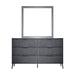 The Kailani Dresser Mirror in gray is a stylish and eco-friendly addition to any bedroom, expertly crafted from a blend of solid rubberwood, engineered wood, and eco-friendly decorative laminate. This construction ensures long-lasting style and sustainability, with the laminate providing superior resistance to scratches, moisture, and stains, making it easy to maintain its beauty over time. The mirror's modern minimalist design, featuring clean lines and a sleek silhouette, embodies contemporary elegance, while the low-distortion glass offers crystal-clear reflection for a true and precise image. This mirror not only enhances the functionality of your space but also adds a touch of sophistication, making it a responsible and chic choice for your home.