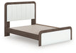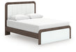 Looking to make a subtly striking statement in your bedroom? We've got you covered. This queen upholstered bed’s sophisticated two-tone treatment marries a warm brown finish over replicated walnut grain with a matte white finish. Highlighted with a wonderful white faux leather, the headboard features warm ambient lighting for that cozy feeling we all love at bedtime. Rounded corners radiate an air of modern panache. It’s a master class in contemporary yet comfortable character.