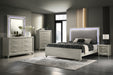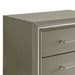 | Featured-2 | Glossy Glam: High Gloss gray finish accents the embossed silver laminate drawer fronts highlighted by clear acrylic drawer pulls. | |