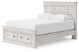 | Details | Includes panel headboard, storage footboard, platform rails and roll slats , Made with engineered wood (MDF/particleboard/plywood) and decorative laminate for the right balance of affordability and durability, Whitewash replicated worn through paint over replicated wood grain with authentic touch, Decorative laminate replicates natural or man-made material surfaces with consistent color, pattern and texture, Handles with dark bronze-tone finish, 2 smooth-gliding storage drawers, Bed does not require additional foundation/box spring; accommodates most zero clearance adjustable bases with the addition of a bunkie board , Mattress available, sold separately, Assembly required | |