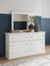 | Details | B139B43: Includes panel headboard/footboard and rails, Made with engineered wood (MDF/particleboard/plywood) and decorative laminate for the right balance of affordability and durability, Replicated solid white paint, Decorative laminate replicates natural or man-made material surfaces with consistent color, pattern and texture, Foundation/box spring required, sold separately, Mattress available, sold separately, Assembly required, B139B40: Includes dresser and mirror, Made of engineered wood (MDF/particleboard), Knobs with pewter-tone finish, Scalloped moulding, 6 smooth-operating drawers, Includes tipover restraint device, Mirror attaches to back of dresser; can also be mounted on wall horizontally or vertically, Safety is a top priority, clothing storage units are designed to meet the most current standard for stability, ASTM F 2057 (ASTM International), Drawers extend out to accommodate maximum access to drawer interior while maintaining safety, | |