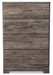 With its clean-lined look and modern attitude, this chest of drawers is a fresh style awakening. A warm gray hue over replicated oak grain easily complements other furniture finishes. Smooth drawer fronts with antiqued pewter-tone handles complete the aesthetic.