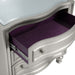 Introducing the Reflection Nightstand in Silver, expertly crafted from solid Pine and high-quality manufactured wood to ensure enduring strength and durability. Its glamorous matte silver finish exudes sophistication, accentuating the mirrored top and silver drawer pulls, adding a touch of elegance to any bedroom decor. Experience luxurious functionality with a mirrored top, bowfront drawers, sumptuous lavender velvet lining, picture frame moldings, and turned bun feet, seamlessly blending classic charm with modern flair. Inside, discover meticulous craftsmanship with English dovetail joinery, full extension drawer glides, finished interiors, and select velvet-lined drawers to safeguard delicate items. Enjoy extra upgrades such as the built-in USB charging port and cedar-lined bottom drawer, offering unparalleled convenience and lifestyle functionality. This nightstand is not just a piece of furniture—it's a marvel of design and practicality, destined to enhance your bedroom space with style and functionality.