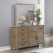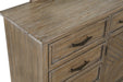 The Tybee Dresser by New Classic Furniture is a testament to real wood construction, ensuring lasting durability. Its natural timeworn appearance, achieved through a meticulous 20-step finishing process, guarantees a unique upscale, heirloom look—no two pieces are identical. The designer-style finish, with layers of stains and glazes, highlights the Pine's mineral stains, grain patterns, and colors, creating a distinctive high-end aesthetic. The sophisticated composition, featuring Chevron pine and plywood panels framed with solid wood moldings, tapered legs, and antique brass finished drawer pulls, reflects timeless craftsmanship. Effortless drawer operation is facilitated by ball-bearing glides, providing smooth, easy-open performance. The clean and carefree storage is emphasized by sanded and sealed drawers, with the top ones lined in felt to protect delicate items. An adjustable shelf behind the doors provides storage for bulkier garments. Crafted with time-tested quality using French dovetail front and English dovetail back craftsmanship, this dresser is a strong and durable addition to your space. Rest easy knowing it complies with safety standards, including CPSIA, TSCA Title VI, and Sturdy Act Guidelines, and is backed by a 1-year limited warranty.