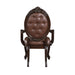 The Royal Classics Palazzo Marina Dining Arm Chairs, set of 2 in Walnut, offers a perfect fusion of enduring craftsmanship and timeless sophistication. Constructed from solid Poplar with Cherry veneers, these armchairs are built to last while maintaining their elegant appeal. The meticulous multi-step finish enhances the natural beauty of the wood, bringing out its rich grain, while the intricately carved details with burnished gold accents add a touch of luxury. The signature circular carving on the chair backs showcases the collection’s hallmark design. Upholstered in luxurious Chestnut brown vegan leather, the button-tufted backs and plush cushions provide exceptional comfort and regal charm, making these armchairs ideal for formal dining settings. Whether for everyday use or special occasions, these chairs add a refined and inviting presence to any dining space.