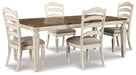 | Details | D743-45: Made of veneers, wood and engineered wood with some cast resin components, Antiqued two-tone finish, Separate extension leaf, Table extends by pulling both ends and dropping in leaf, Seats up to 8, Assembly required, D743-01: Made with wood and engineered wood, Distressed, chipped white finish, Ladderback styling, Polyester upholstery over foam cushioned seat, Assembly required, | |