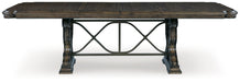 | Details | Made with hardwood solids, oak and ash swirl veneers, MDF substrates and cast resin components, Dark brown finish, Double pedestal base, Removable center leaf, Table extends by pulling both ends and dropping in leaf, Shaped metal stretcher bar, Dining chairs sold separately, Seats up to 8, Assembly required | |