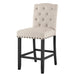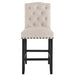 Embrace the allure of natural beauty and timeless elegance with the Daphne 5 Piece Counter Dining set. Crafted with meticulous care and attention to detail, this set features a combination of solid Rubberwood, manufactured woods, and eco-friendly decorative laminate, ensuring a durable and long-lasting addition to your dining space. The resilient finish of the heat, scratch, and water-resistant tabletop provides extra protection, maintaining the set's pristine appearance even with regular use. Enhanced by a natural finish tabletop and chair fabric, accented with rich espresso brown legs and aprons, this set exudes a captivating ambiance, perfect for creating memorable dining experiences. Indulge in plush comfort with easy-care 100% polyester fabric wrapping high-density foam cushions, offering a cozy and supportive seat for every meal. Classic details such as button-tufted chair backs and nailhead trims along the bottom cushions add a touch of traditional charm to modern-day dining, completing the ensemble with sophistication and grace. Elevate your dining room with the Daphne Dining Set, where quality craftsmanship and timeless design converge to create an inviting and stylish space for gatherings with loved ones.