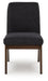 Casual contemporary styling with a decidedly modern vibe. Sitting atop a mid-century inspired base, this upholstered bucket dining chair has a rich warm brown finish that beckons everyone to gather around. Black textured upholstery dresses the chair in on-trend elegance. It's a simply stunning show of great taste.