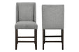 The Faust Upholstered Parsons Counter Dining Chairs offer a blend of luxury and durability, making them an excellent addition to any dining space. This set includes two Parsons counter chairs, each crafted from solid rubberwood and eco-friendly manufactured woods to ensure strength and durability. The solid wood legs and base stretchers provide extra stability, making these chairs a reliable choice. The 100% polyester tweed fabric fully upholsters the chairs, offering a soft, comfortable, and easy-to-clean surface. Featuring a sleek, contemporary design, the chairs are enhanced with decorative nailhead trim along the edges, adding a touch of elegance and sophistication. The dark wooden legs create a striking contrast to the light gray upholstery, resulting in a balanced and modern aesthetic. Ideal for those seeking a combination of style, comfort, and durability, the Faust Parsons Counter Dining Chairs are perfect for elevating your dining area.