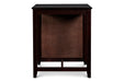 The small space friendly Gia Counter Storage Table and Chair Set has a built-in shelf unit that provides the ideal spot for dinnerware or kitchen essentials. The dining table and chair legs are crafted of solid Rubberwood to add strength and stability. Mindi veneers on the table top and chair offer beautiful wood grain patterns that are enhanced with a multi-step deep, dark brown finish with a hint of red. The result is a sleek, modern counter dining set that ideal for dining rooms, kitchen nooks, dorms or game rooms. Comfortable counter height chairs feature black pu upholstered seat cushions and backs, and wood footrests. The final touch is Gia's signature interlocking chain design on the chair back, giving this clean, contemporary dining set a touch of sophistication.