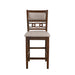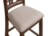 The stylish Gia 5 Piece Counter Dining Table and Chair set is built with comfort, durability and function in mind. This dining set provides spacious seating for four, with the added convenience of two storage shelves located under the table top, perfect for storing dinnerware or board games to pull out on game night. The counter table apron, table legs and dining chair legs are crafted of solid Rubberwood to add strength. The counter chairs gain added stability from 4 wood base stretchers that double as relaxing foot rests. The distinctive reverse diamond Mindi wood veneer dining table top accents the beautiful wood grains which are highlighted by the multi-step traditional brown cherry finish. The set includes four comfortable counter height chairs with 100% polyester light brown upholstered seat cushions and backrests. The final touch is Gia's signature interlocking chain design on the chair back, giving this welcoming dining set a touch of sophistication. The result is a casual, contemporary dining set, perfect for your dining room or kitchen.