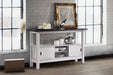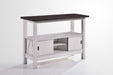 | Featured-2 | Rustic, Farmhouse Finish: The Server has a dark brown top with a smooth finish, providing a modern contrast to the rustic design. The cabinet base is painted white and slightly distressed, enhancing the farmhouse appeal and adding character. | |