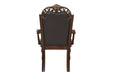 The Royal Classics Maximus Dining Arm Chairs (Set of 2) in cherry are a perfect blend of heirloom craftsmanship and timeless design. Meticulously crafted from solid poplar and premium birch veneers, these chairs are built for long-lasting beauty and durability. The multi-step cherry finish enhances the natural wood grain, while delicately burnished gold tipping adds a luxurious touch to the intricate carvings. Inspired by Baroque and Rococo styles, the ornate detailing brings an air of regal elegance and sophistication to your dining space. Upholstered in sumptuous chocolate brown vegan leather, the button-tufted backs and plush cushions offer both an elegant look and supportive, comfortable seating for a truly luxurious dining experience.