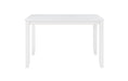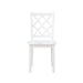 The Trellis 5 Piece Dining Set in white offers a blend of style and functionality, perfect for any dining area. This set includes one dining table and four chairs, all crafted from solid rubberwood, manufactured wood, and birch veneers, ensuring long-lasting durability. The white farmhouse finish is purposely weathered with burnished edges, creating a charming heirloom look. The diamond trellis-style chair backs, curved legs, and tapered table and chair legs give this casual dining set distinctive details that set it apart. The solid wood chairs feature contoured saddle seats designed for ergonomic comfort, conforming to the natural curve of the body. Ideal for small space dining, this set comfortably seats four, making it perfect for kitchens or cozy dining areas. With table dimensions of 47.75" D x 36" W x 30" H and chair dimensions of 18" D x 21" W x 36" H, it provides a practical solution without compromising on style. Enhance your dining space with the Trellis 5 Piece Dining Set, offering a perfect blend of comfort and timeless design.
