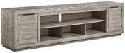Details Made of pine wood, pine veneer and engineered wood, Weathered light gray finish, 2 side cabinets each with single adjustable shelf, Fixed open center shelf, 3 open cubbies, Cutouts for wire management, Power cord included; UL Listed, Assembly required
