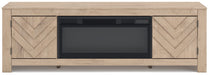 This TV stand with electric fireplace embraces a classically charming aesthetic and repurposes it for modern living. Its light replicated wood grain appeals to your love of vintage character, while the chic chevron pattern is effortlessly on trend. Media accessories stay tucked away in style with hidden storage behind the doors. And for added ambiance, the electric fireplace brings a cozy-cool vibe to your living room. With the touch of a button, activate the LED-lit flame and adjust the temperature or the flame brightness. The flame effect includes multiple color options and a realistic-looking faux birch log set.