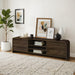 Introducing the Mara 70" TV Console in Walnut, a perfect blend of style and sustainability for your entertainment needs. Crafted from sturdy manufactured wood and coated in environmentally friendly laminate, this console boasts both durability and eco-consciousness. Its ample top surface accommodates large screen televisions, while shelves offer space for entertainment components. Two spacious drawers discreetly store games, controllers, and other family room essentials. The minimalist design, featuring curved drawer fronts and waterfall-style tops and sides, adds a modern touch to any space. Finished in a classic walnut hue, it effortlessly complements a variety of décors, enhancing the aesthetic of your room. Upgrade your entertainment area with the Mara 70" TV Console in Walnut.