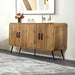 The Rowan 63" Sideboard doubles as a stylish TV stand with mid-century modern flair. Crafted from eco-friendly manufactured wood in a warm oak finish, it features rounded corners, black hardware, and tapered legs. Four cabinet doors conceal spacious shelves—perfect for storing media, electronics, or dining essentials. A versatile piece that works beautifully in living or dining spaces.