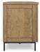 | Details | Made with solid wood frame, birch veneer, MDF substrate and steel, Clean medium brown wood finish, Tubular steel legs with matte black powder coat finish, 2 outside cabinets, each with an adjustable shelf for concealed storage, Center cabinet with inset glass doors and 2 adjustable shelves, Cutouts for cord management, Assembly required | |