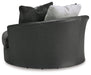 Appeal to your eye for ultra-contemporary design with this oversized swivel chair. Chic and sleek in dark neutrals, it pairs cozy fabric with faux leather for invitingly cool character. And with its robust size offering extra seating space, you can chill out in comfort and style.