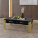 Introducing the Empire Coffee Table, a stylish and functional centerpiece for your living space. Crafted with durable eco-friendly materials and a sleek black finish, this table ensures long-lasting durability while adding a touch of contemporary elegance to your room. Its modern metro style, featuring gleaming gold tiered legs, evokes the enchanting allure of a city skyline under the stars. Enjoy convenient storage with two drawers, perfect for keeping remotes and other living room essentials organized and within reach. Elevate your living area with the Empire Coffee Table, where style meets practicality.