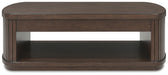 This richly finished lift-top coffee table makes life easy—in a casual, contemporary kinda way. The table's spacious lower shelf is ideal for displaying treasures, while two storage bins underneath the top are ideal for storing smaller items out of sight. Its center lift top transforms into a work area or extra dining space when needed. Casters let you move the table wherever and whenever you want.