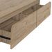 Discover the Mara Storage Cocktail Table, a blend of sturdy construction and eco-friendly materials. Crafted from durable manufactured wood and adorned with environmentally friendly laminate, this table boasts both sustainability and style. With its ample 47" surface area, it offers space for drinks and décor, while two spacious drawers provide convenient storage for reading materials and remotes. The minimalist design, accentuated by curved drawer fronts and waterfall-style tops and sides, lends a modern appeal to any room. Finished in a light, natural beige hue, it effortlessly complements a variety of décors, making it a versatile addition to your home. Experience functionality and elegance with the Mara Storage Cocktail Table.