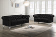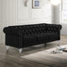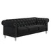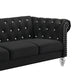 The New Classic Emma Chesterfield Velvet 3 Seat Sofa is a blend of soft elegance and sophisticated design. Crafted from 100% polyester velvet fabric, it offers cozy and indulgent seating for three. The glam tailoring features tufted backs and arms adorned with glimmering crystal buttons, adding a touch of luxury without compromising comfort. Upscale accents, including silver nailhead trim on the rolled arms and silver turned bun feet, enhance the black velvet fabric. Shipped unassembled for easy placement in any home, its lower profile height makes it small space-friendly, fitting well into smaller rooms while providing full-size seating. Enjoy supportive seating with full foam cushions that provide ample comfort. Add a little sparkle in your home with the Emma Sofa.