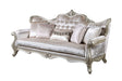 The Monique Royal Classic Sofa in champagne epitomizes heirloom-quality craftsmanship and timeless elegance. Expertly constructed from premium pine solids and adorned with durable polyurethane carvings, this sofa is lightweight, moisture-resistant, and pest-resistant, ensuring long-lasting beauty and durability. The 100% polyester velveteen fabric, adorned with a refined Fleur-de-Lis pattern, graces the crystal button-tufted backs and cushions. Complemented by five sophisticated accent pillows with mixed patterns, this sofa exudes luxurious sophistication. Traditional Victorian styling, featuring intricate detailing, ornate carvings, and plushly tufted backs, lends an elegant Victorian feel. The curved lines and elaborate design elements enhance its sophisticated look, making it a striking centerpiece for any living room. Experience opulent comfort with high-density foam backs and premium pocket coil cushions that provide unparalleled support and exquisite relaxation. For added convenience, the sofa back is shipped unattached, allowing for easy maneuvering into your home and secure assembly in just 15 minutes. This sofa promises to transform your living space with its refined style and comfort.